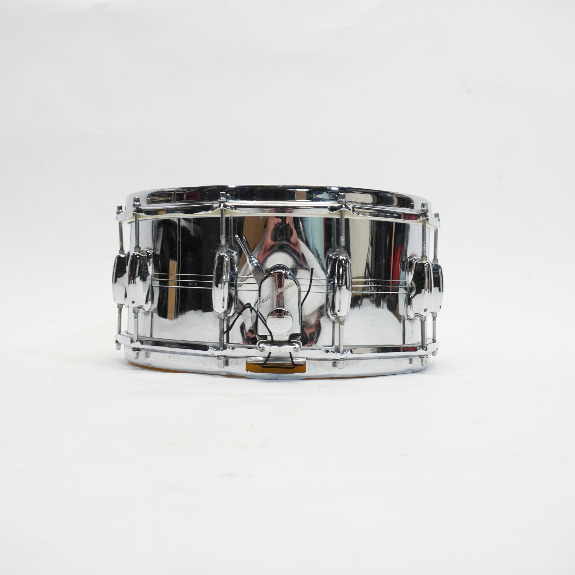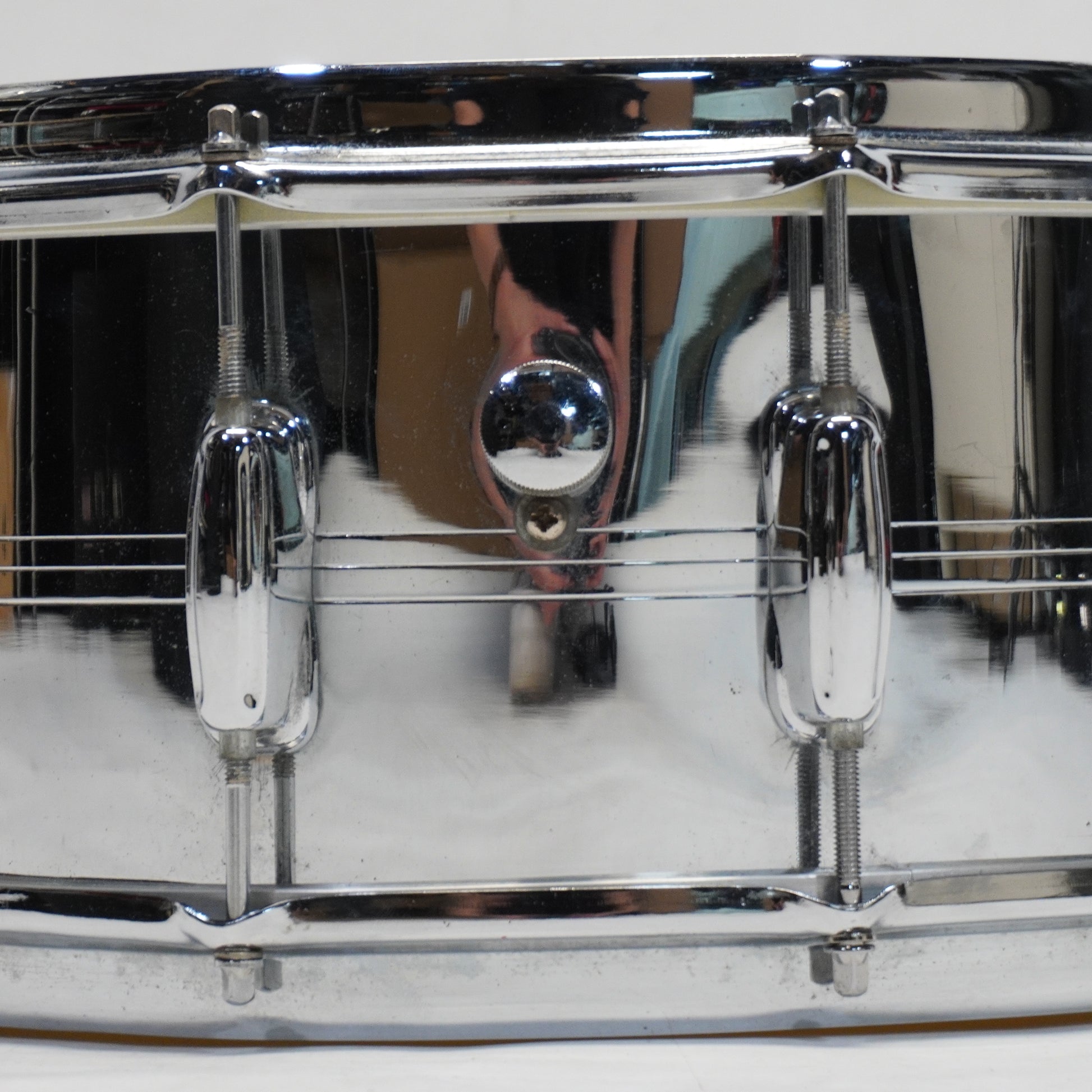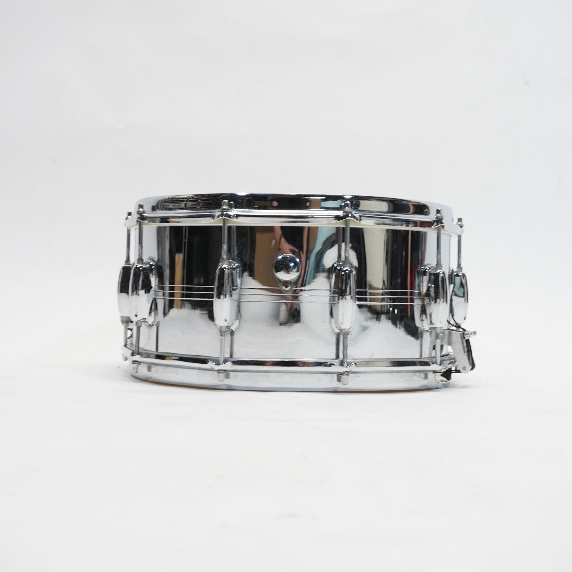 This is a Slingerland Sound King Gene Krupa 14" Snare Drum featuring a classic chrome-over-brass (COB) shell that delivers a warm, full-bodied tone with sharp, articulate attack.