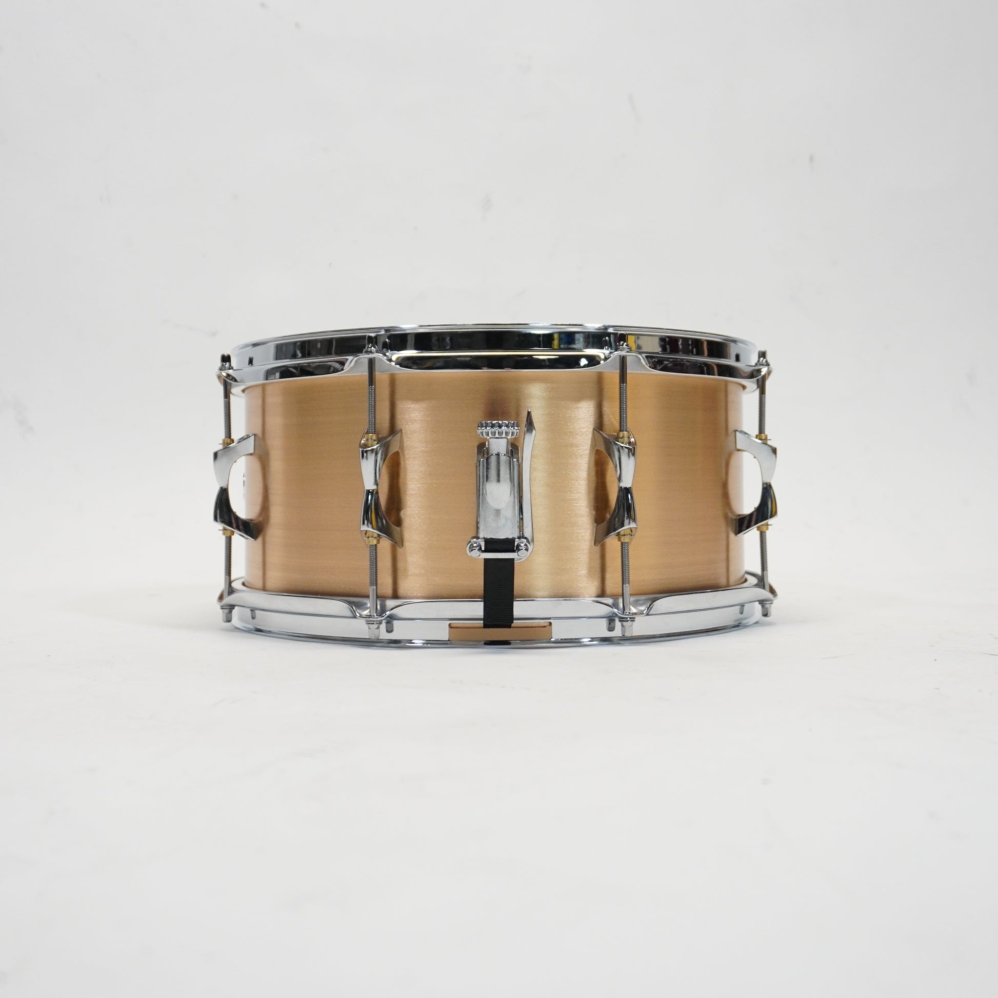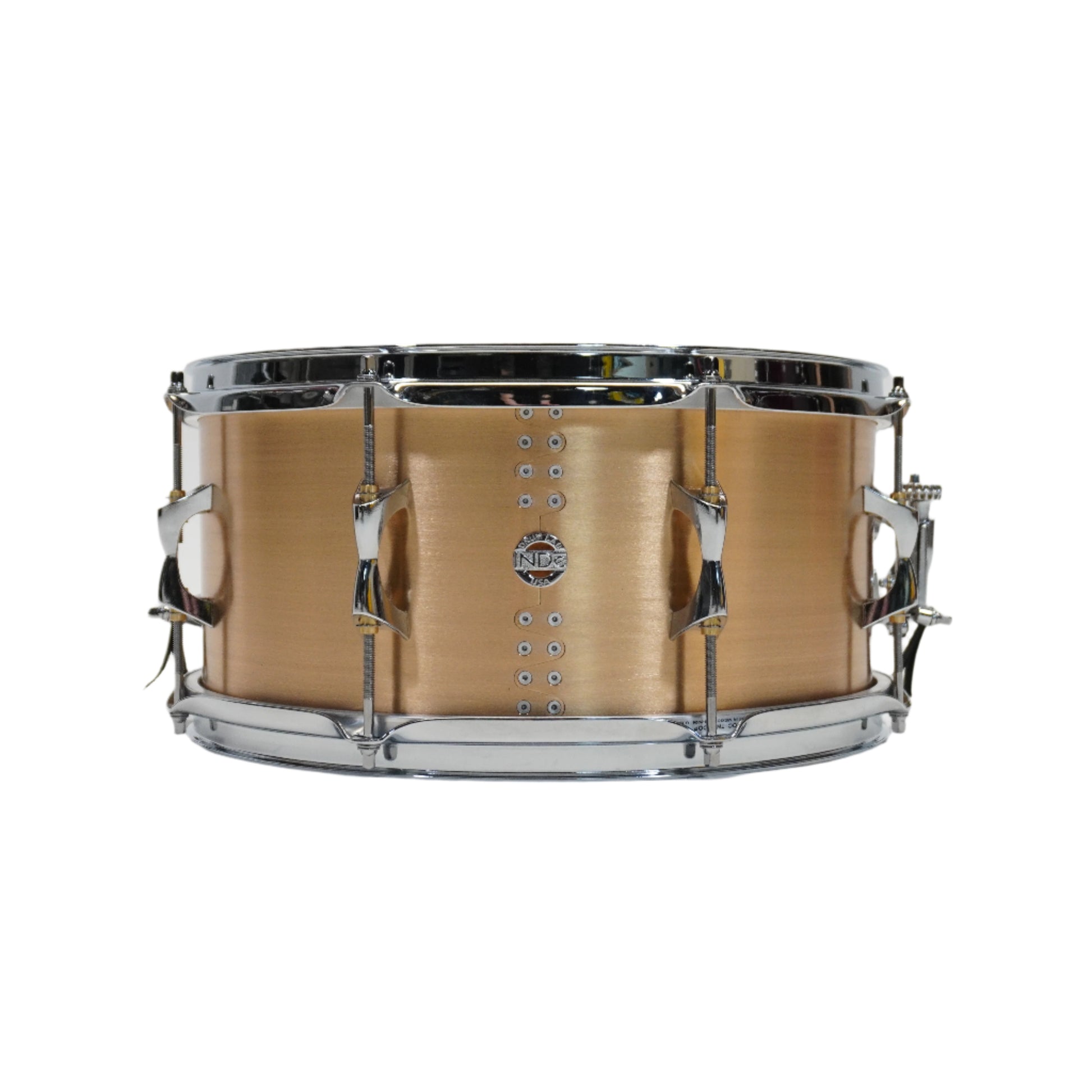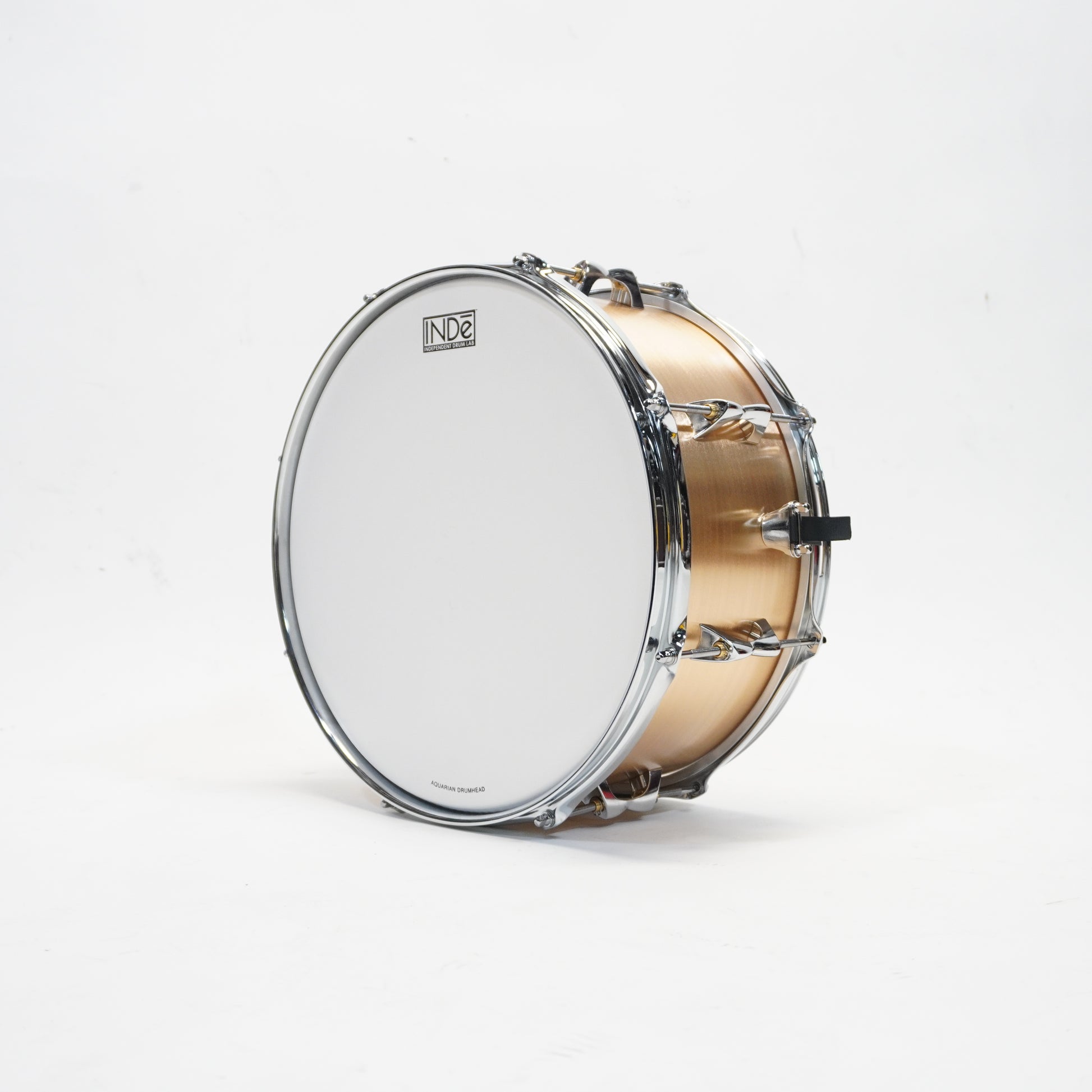 • Shell: .060” Aluminum or Bronze, hand-rolled and riveted, Infinite Snare Bed • 8 INDe double-ended lugs • INDe SB1 Snare Strainer and Butt-Plate • Hoops: Choice of 2.3mm Triple-Flanged Chrome over Steel, Triple-Flanged Chrome over Brass (14” drums only), or Die-Cast (14” drums only) • Heads: Aquarian Drum Heads