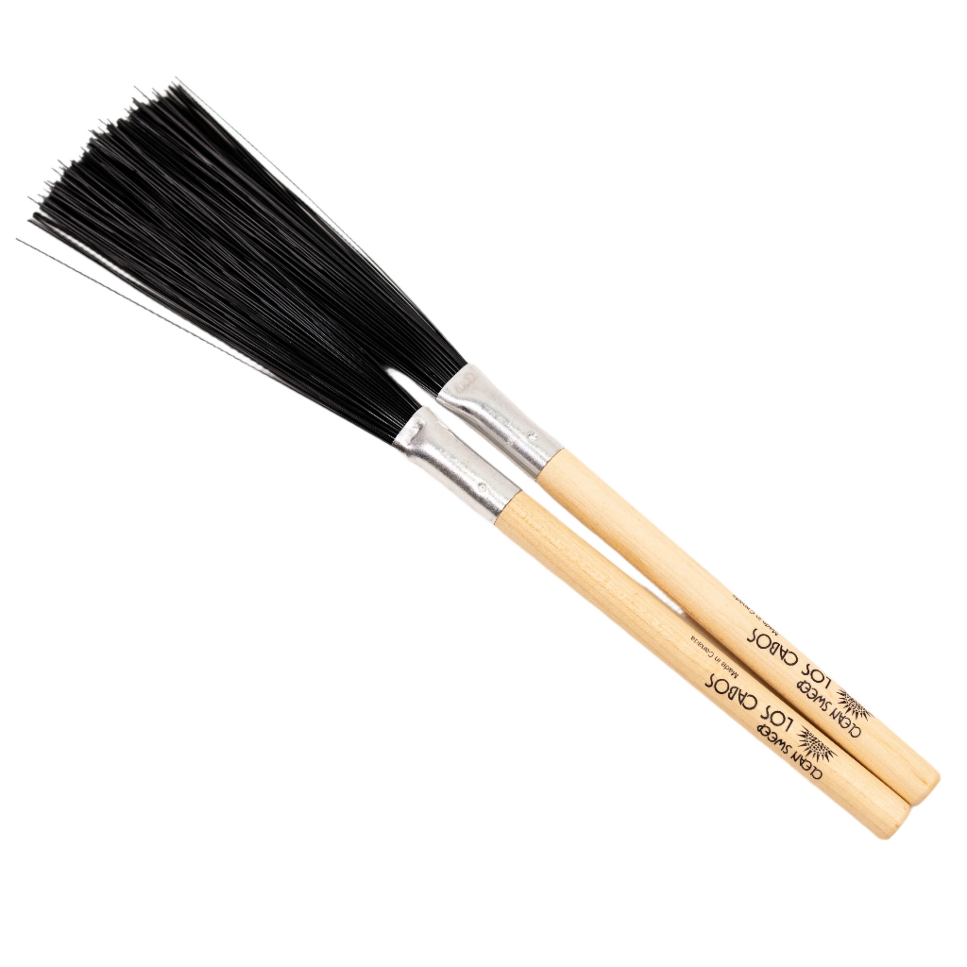 The Los Cabos Clean Sweep is a specialized drum brush designed to produce a softer, more nuanced tone compared to traditional wire brushes. Unlike the retractable Standard model, the Clean Sweep features a non-retractable design with blue nylon bristles and a wooden handle, offering a distinct playing experience.