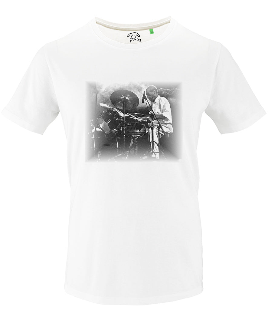 Introducing the Max Roach Bleed T-Shirt, exclusively designed by Porgy for Rubix Drums. This limited-edition tee merges style and sustainability with its recycled cotton fabric, honoring the legendary jazz drummer Max Roach through a striking, bold graphic.